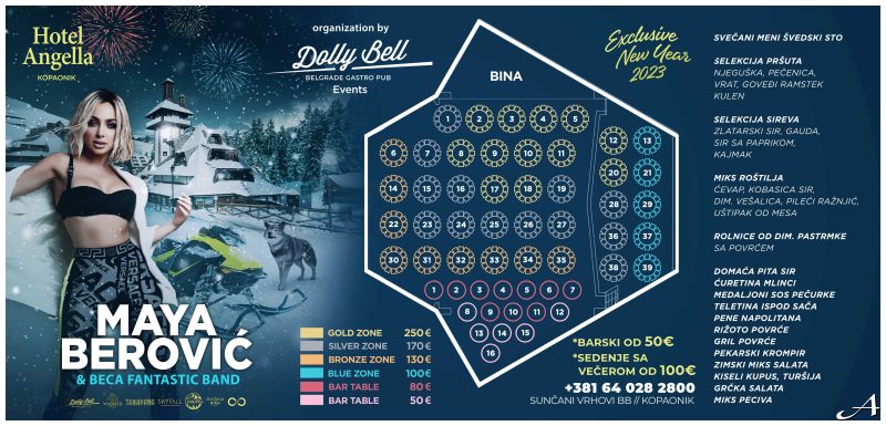 hotelu Angella Kopaonik će specijalno za ovu priliku nastupiti jedna od najvećih muzičkih zvezda sa ovih prostora, Maya Berović. Ovaj nastup biće jedan od centralnih muzičkih i zabavnih sadržaja ove zimske sezone na Kopaoniku, a za organizaciju je zadužena ekipa iz