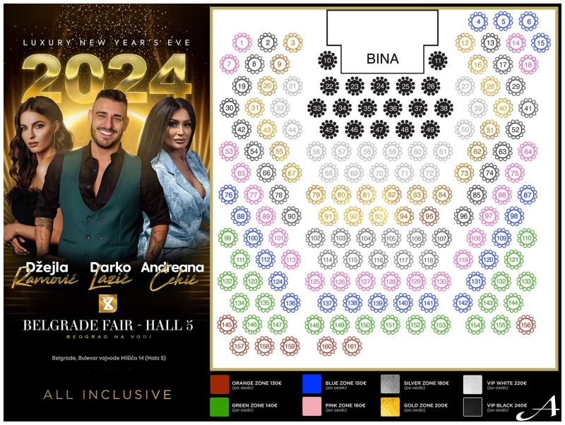 Cena po osobi se kreće od 130€ do 240€ u zavisnosti od pozicije stola u samoj sali i uključuje elegantno mesto za sedenje, kompletnu večeru i neograničenu konzumaciju alkoholnih i bezalkoholnih pića tokom cele večeri (vidi na mapi, klikni na mapu za uvećan prikaz).