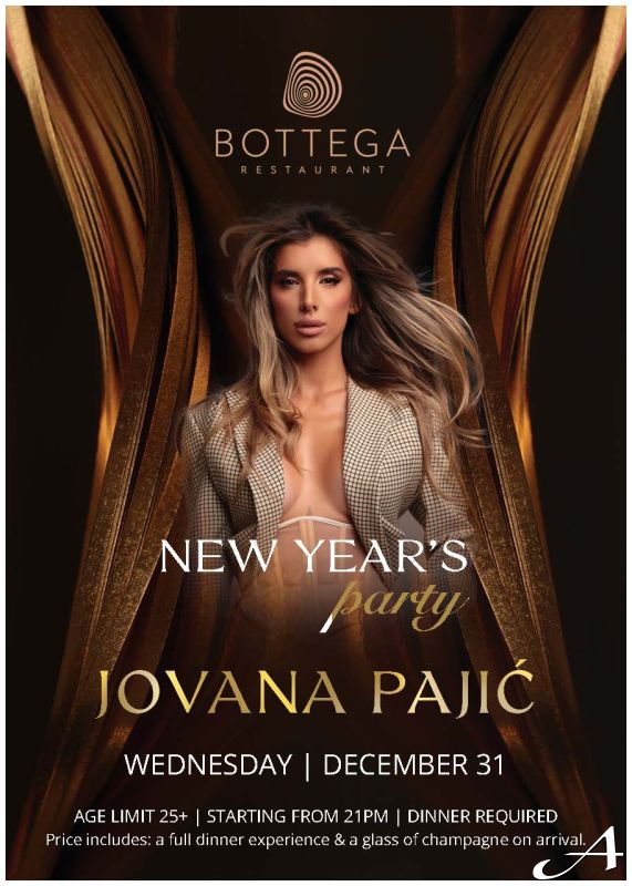 Za ljubitelje muzike, restoran Bottega svakodnevno nudi bogat muzički program, a za doček Nove godine možete očekivati pravi užitak uz Jovanu Pajić. Bilo da ste ljubitelj ekskluzivnih specijaliteta ili jednostavno uživate u vrhunskoj muzici uz izvanredan obrok, Bottega je savršen izbor za proslavu Nove godine u Beogradu. Ne propustite priliku da doživite jedinstvenu atmosferu i uživate u nezaboravnom dočeku Nove godine 2025. u restoranu Bottega.