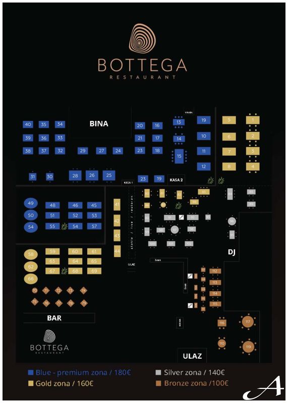 Bronze zona - 100€ Silver zona - 140€ Gold zona - 160€ Blue - premium zona - 180€