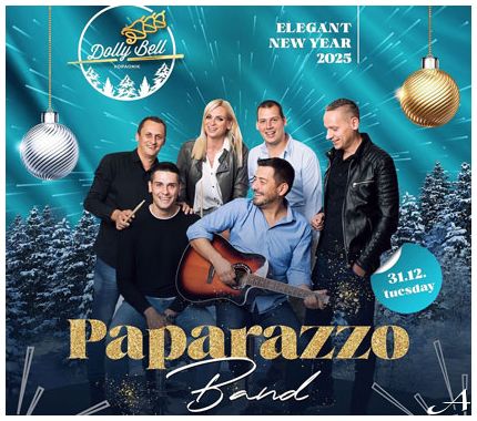 Paparazzo bend. Njihova energična muzika i bogat repertoar garantuju nezaboravnu zabavu i ples do ranih jutarnjih sati. Uz zvuke popularnih hitova, vaš doček Nove godine biće ispunjen smehom, plesom i veseljem.