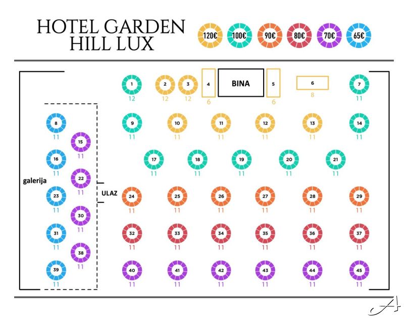 *Napomena: Orijentaciona mapa prostora. U skladu sa novogodišnjom postavkom sale, moguća su manja odstupanja u rasporedu stolova.