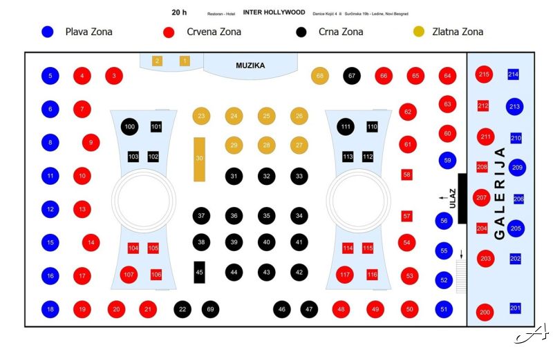 Cena po osobi se kreće od 50 eur do eur u zavisnosti od pozicije stola u samoj sali i uključuje elegantno mesto za sedenje, kompletnu večeru i neograničenu konzumaciju pića tokom cele večeri (vidi na mapi).