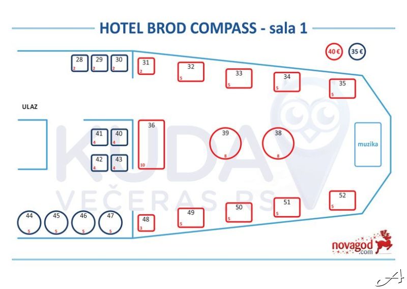 Stvorite najlepše uspomene u novogodišnjoj noći i izdvojite se od drugih! Brod u svom sastavu ima zatvorenu salu za proslave, kao i terasu. Kapacitet zavisi od načina nameštanja sale i terase. Kapacitet svecane sale je do 220 ljudi, a konferencijska sala može da primi do 300 ljudi.