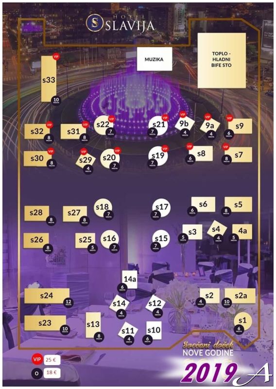18€Cena podrazumeva bogatu večeru, neograničenu konzumaciju pića i klasično restoransko sedeće mesto za svečanim stolom!
