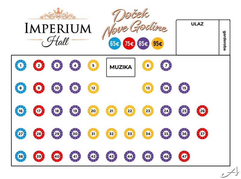 *Napomena: Orijentaciona mapa prostora. U skladu sa novogodišnjom postavkom sale, moguća su manja odstupanja u rasporedu stolova.