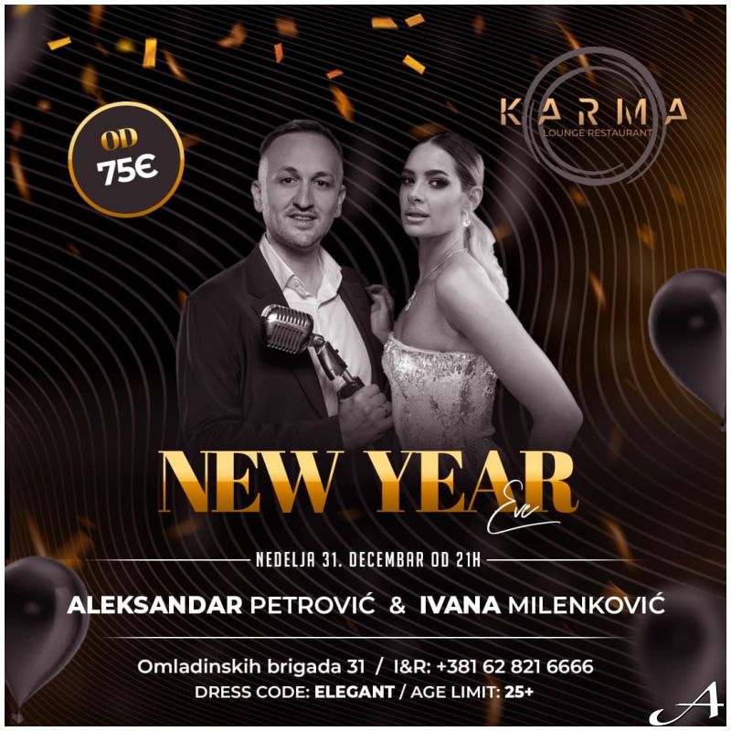 Dobrodošli u restoran Karma, gde se praznična magija i kulinarsko umeće spajaju za nezaboravan doček Nove godine.Dress code: elegant