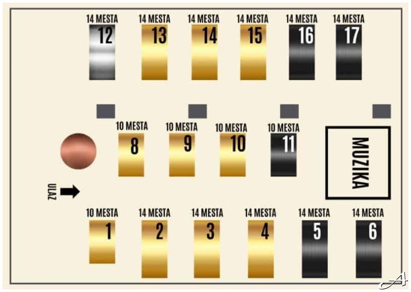 od 75€ do 120€.Cena zavisi od pozicije stola (videti na mapi ispod)