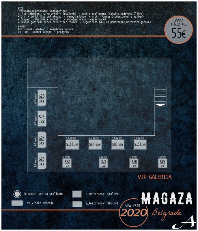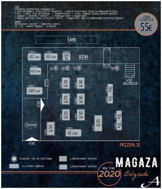 Beogradu, nacionalnoj hrani i muzici svim našim gostima. Cilj nam je da svako od vas u našem ambijentu pronađe svoje mesto za provod u najpopularnijoj noći na svetu, novogodišnjoj noći.