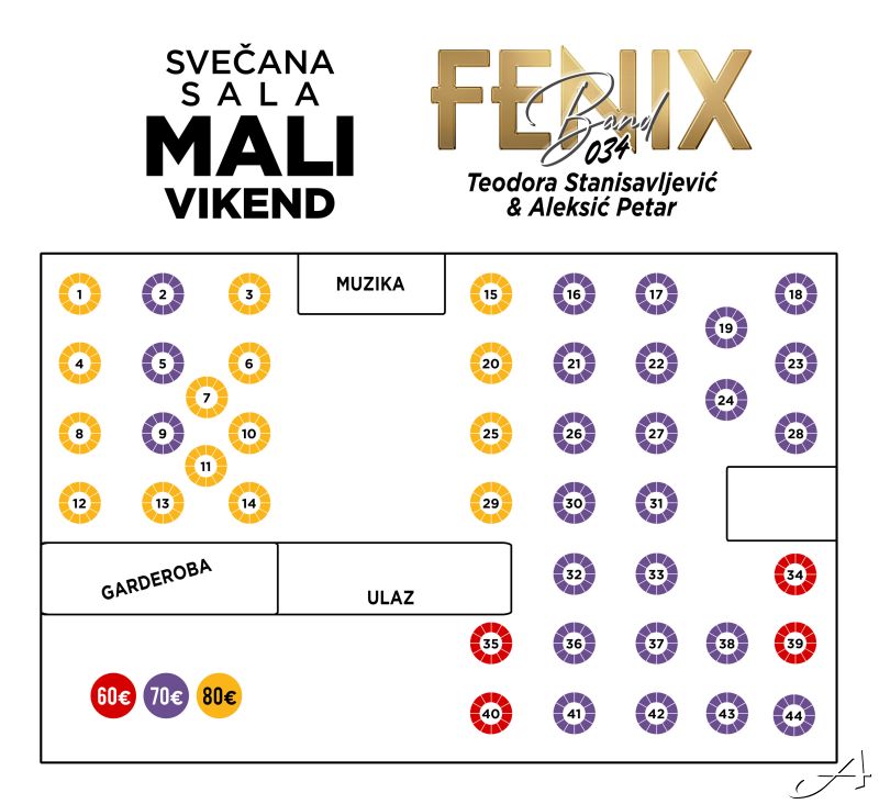*Napomena: Orijentaciona mapa prostora. U skladu sa novogodišnjom postavkom sale, moguća su manja odstupanja u rasporedu stolova. Cena