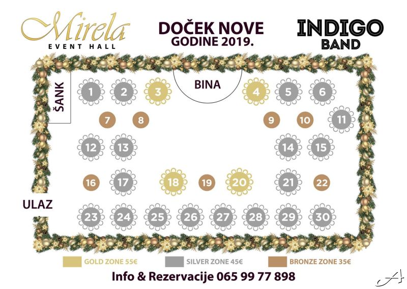 Od 35€ U cenu karte je ukljucena neograničena konzumacija hrane i pica tokom cele večeri: - 35€ - mesto za barskim stolom i barskom stolicom (bronzana zona) - 45€ - mesto za svecanim stolom (srebrna zona) - 55€ - mesto za svecanim stolom sa dodatnim menijem (zlatna zona)