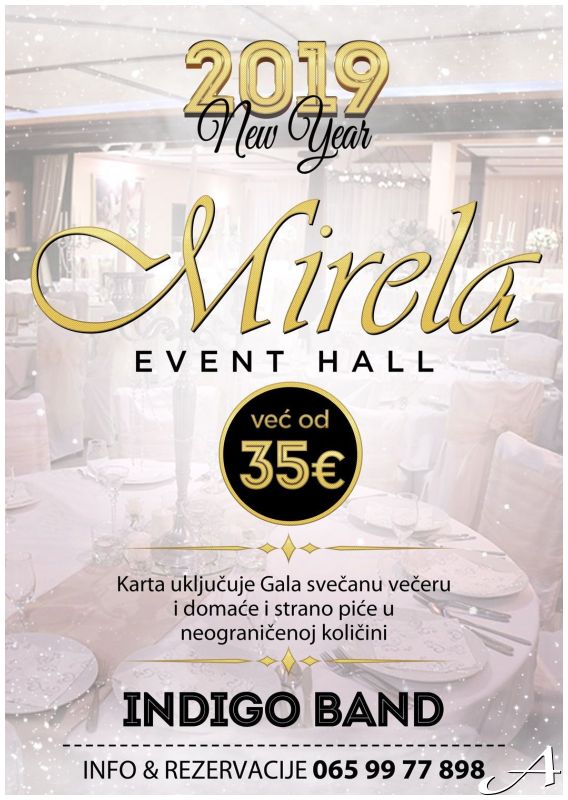 Jedinstven ambijent spojen sa elegancijom, sala sa lokacijom u srcu Zemuna, obezbeđenim parkingom, vrhunskom uslugom i fenomenalnom ponudom za doček Nove godine je mesto gde su mnogi parovi rekli sudbonosno "da", očarani prelepom energijom koji vas čeka u Mireli.