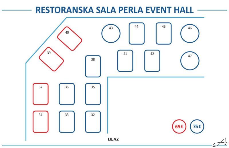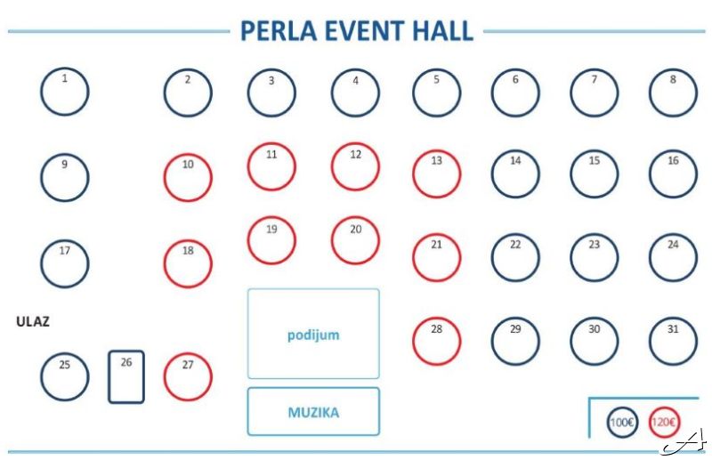 *Napomena: Orijentaciona mapa prostora. U skladu sa novogodišnjom postavkom sale, moguća su manja odstupanja u rasporedu stolova.