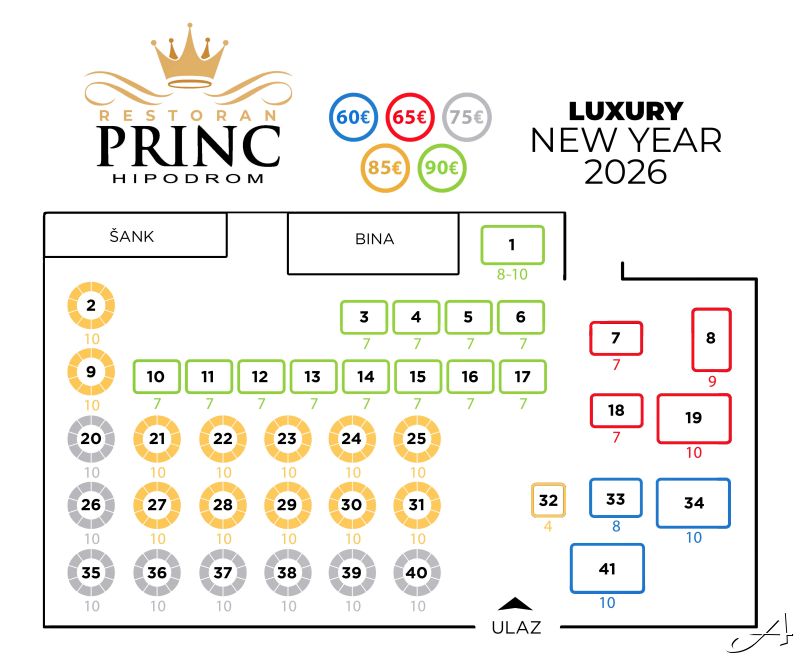 *Napomena: Orijentaciona mapa prostora. U skladu sa novogodišnjom postavkom sale, moguća su manja odstupanja u rasporedu stolova.