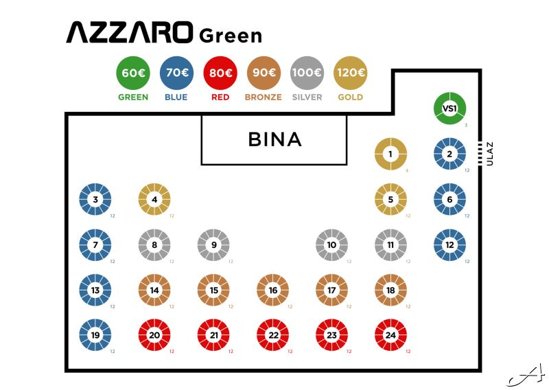 Cena po osobi se kreće o d 60€ do 120€ u zavisnosti od pozicije stola u samoj sali (videti na mapi sedenja) i uključuje elegantno mesto za sedenje, svečanu večeru na bazi set menija i All Inclusive ponudu pića tokom cele večeri.