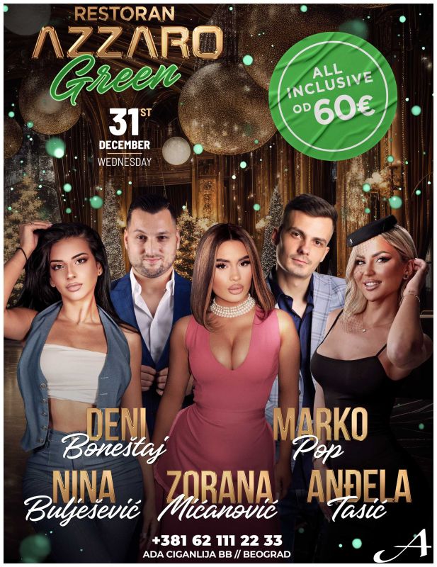 Azzaro Green Club Nova godina 2026 biće spoj luksuza, muzike i emocija — noć koju ćete pamtiti po osmesima, plesu i pravoj prazničnoj atmosferi koja traje do jutra.