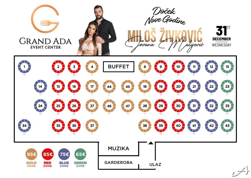 Cena po osobi se kreće od 65€ do 90€ u zavisnosti od pozicije stola u samoj sali i uključuje elegantno mesto za sedenje, svečanu večeru na bazi švedskog stola i all inclusive ponudu pića tokom čitave večeri, (vidi na mapi) .