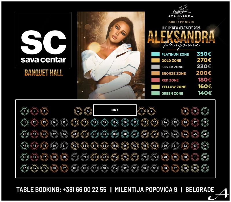 Jedna od najpopularnijih pevačica današnjice, Aleksandra Prijović, dočekaće Novu 2026. godinu sa publikom u prestižnom prostoru Banquet Hall Sava Centra. U pitanju je novogodišnji spektakl koji spaja luksuz, vrhunsku produkciju i emociju, u ambijentu koji odiše elegancijom i stilom.