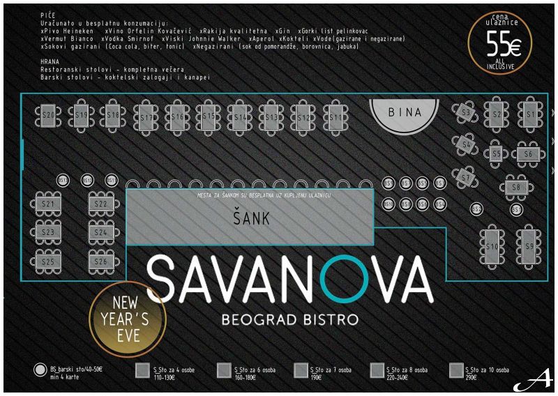 Mesta za šankom sa barskim stolicama - kupovinom ulaznice bez rezervacije, stičete pravo da uživate u dočeku u Savanovi, za velikim centralnim šankom sa barskim stolicama. U cenu je uključena konzumacija svih navedenih domaćih i stranih pića.
