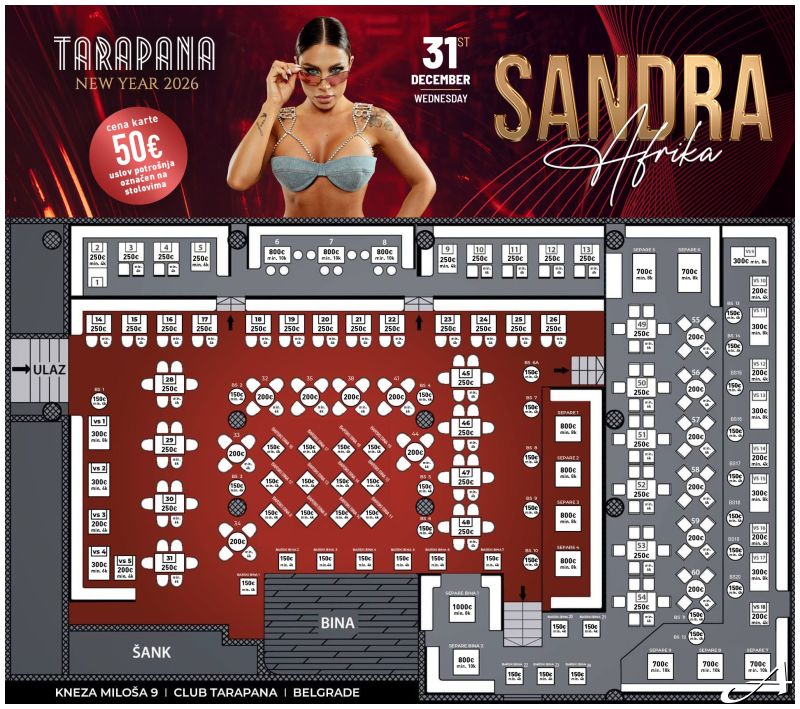 Za nezaboravnu noć pobrinuće se Sandra Afrika - pevačica koja svaki svoj nastup pretvori u spektakl. Njena energija, harizma i hitovi koji su osvojili ceo region garantuju provod do ranih jutarnjih sati.
