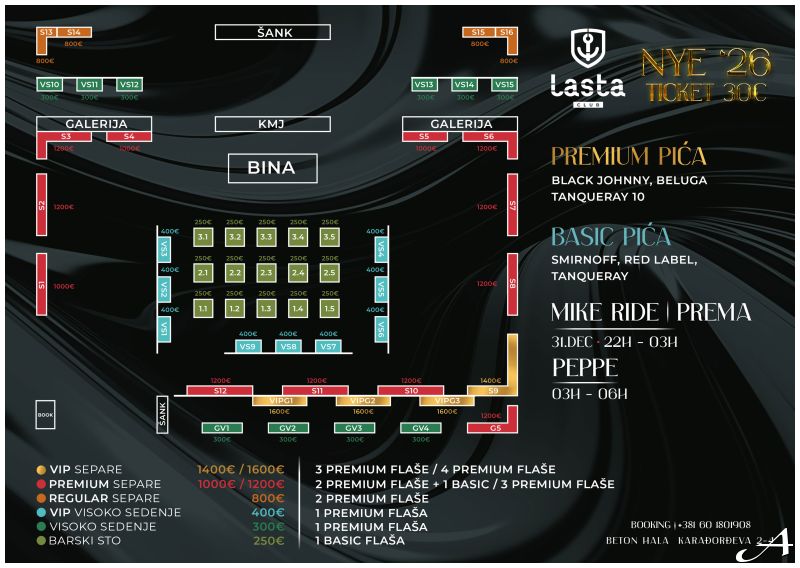Cena ulaznice za doček je 30€ po osobi, svaka rezervacija se dodatno doplaćuje na grupnoj bazi.Barski sto -
