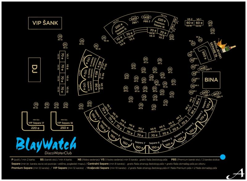 - Za organizaciju celokupnog dočeka zadužen je iskusan tim ljudi, koji se već godinama brine da splav Blaywatch nosi titulu najprestižnijeg splava u Beogradu! Potpuno renoviran splav Blaywatch je tu da Vas maksimalno ugosti i da se potpuno opustite i uživate