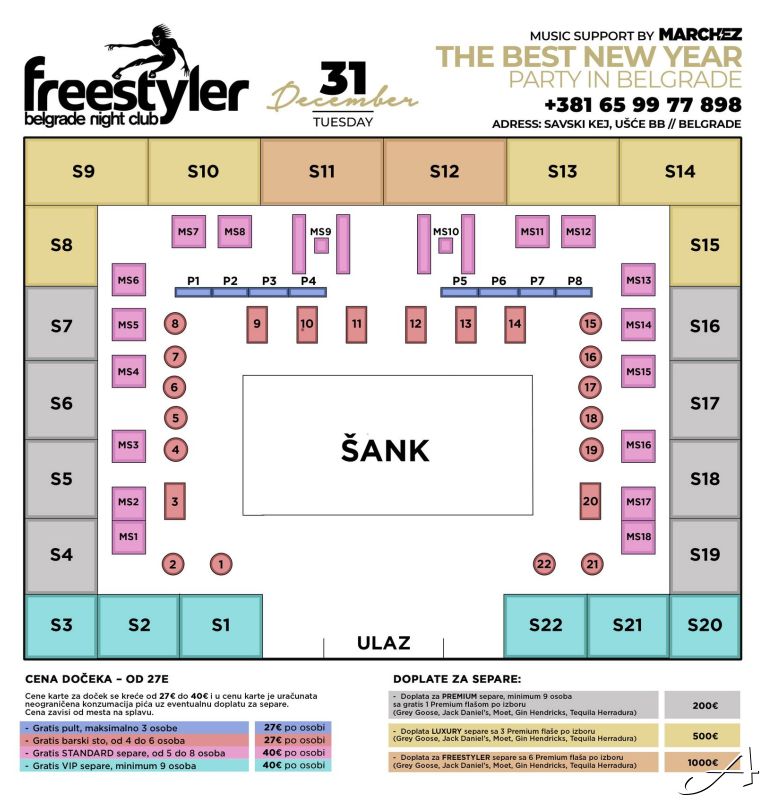 doček Nove Godine u Beogradu sinonim za najbolji provod, zbog svoje najsavremenije opreme i senzacionalnog osvetljenja, splav Freestyler je ubedljivo prvi na mapi prestonice i celog regiona.