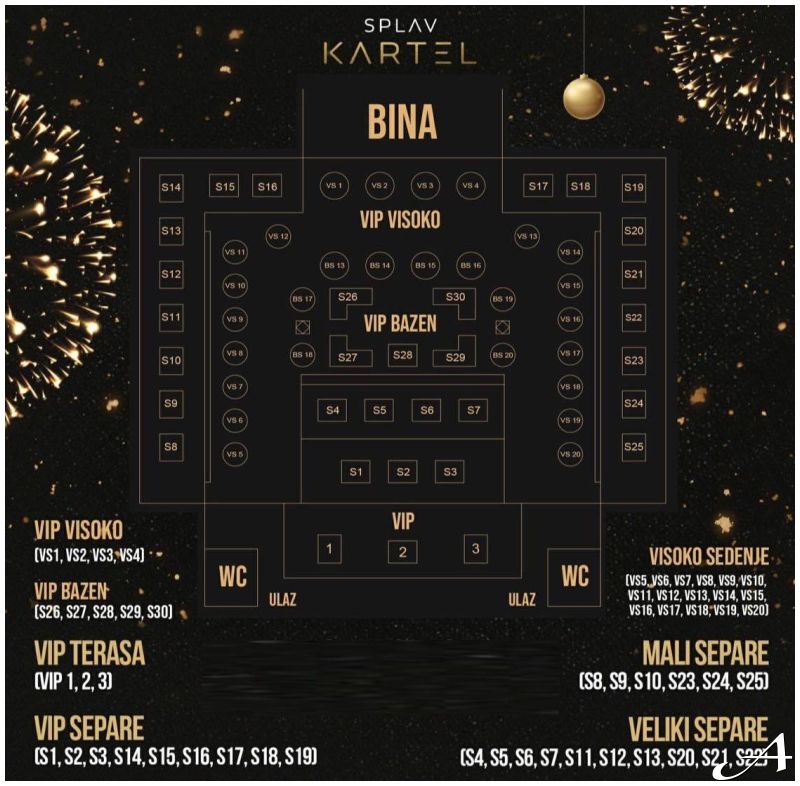Vip separei 350€ sa gratis 4 flaše stranog žestokog pića po izboru (viski ili vodka), 20 energetskih pića, 2 flaše šampanjca, 2 flaše vina (vidi na mapi, na mapi su vip separei označeni sa s od broja 1 do broja 3, kao i sa s od broja 14 do broja 19)