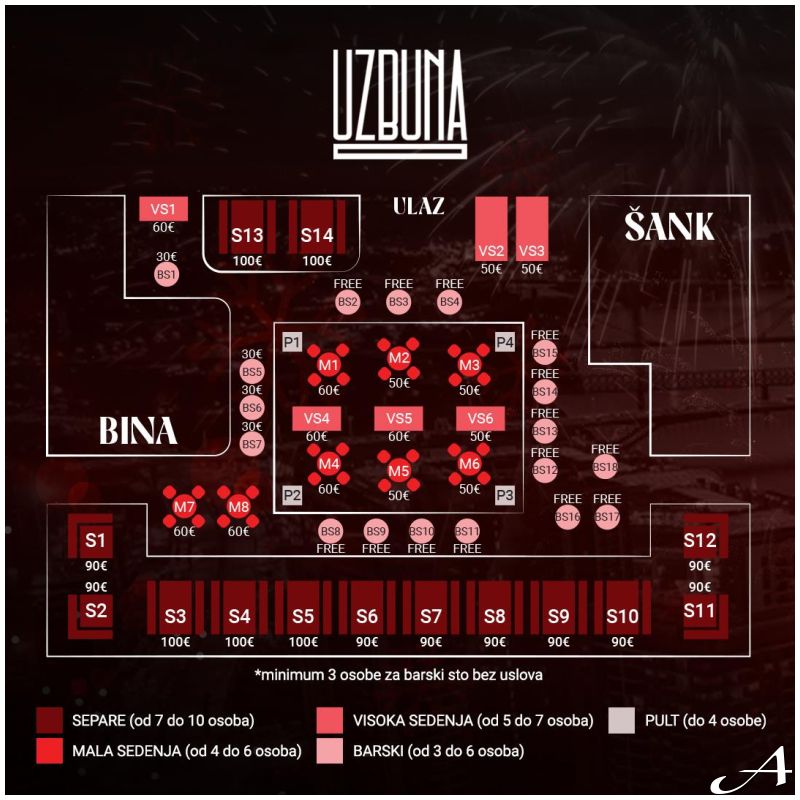 Rezervacije se doplaćuju po grupnom sistemu i različitih su cena u zavisnosti od pozicije u lokalu kao i komoditeta i ponude (pogledati mapu).